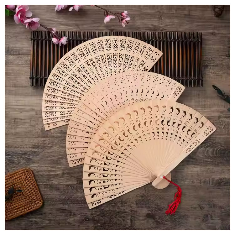 Каждый веер, искусно изготовленный из натурального бамбука, имеет замысловатые вырезы и гладкую поверхность, напоминающую традиционную элегантность. Идеальное сочетание функциональности и эстетики, идеально подходящее для вечеринок в винтажном стиле, свадеб на открытом воздухе или культурных мероприятий.