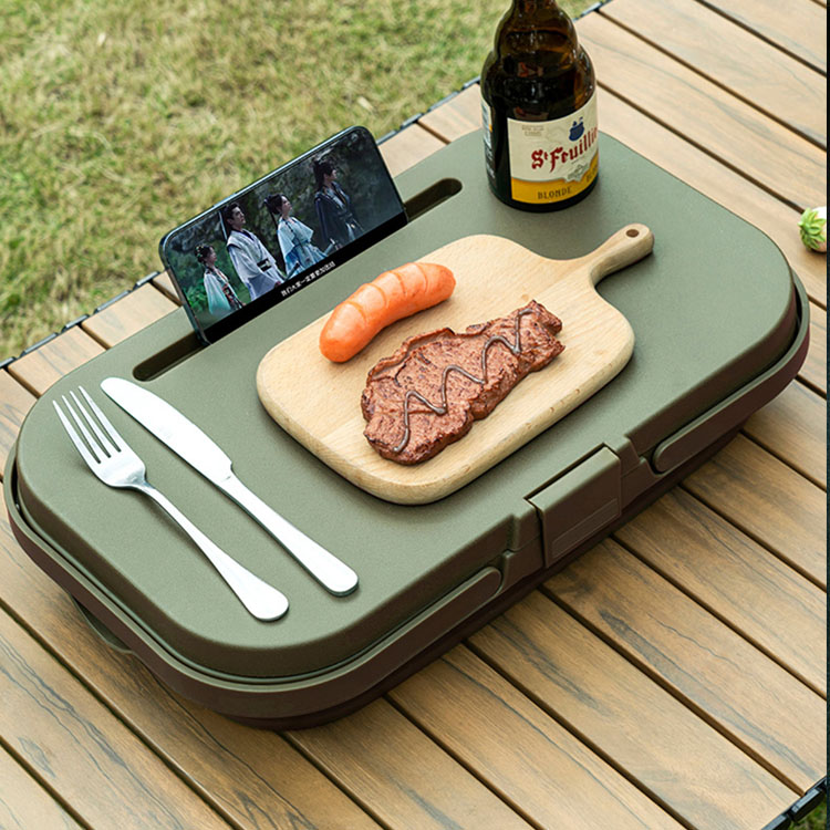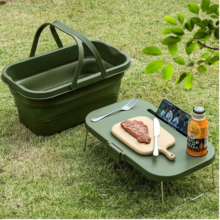 Эта инновационная корзина за считанные секунды превращается из глубокого контейнера для хранения в плоскую устойчивую поверхность стола, обеспечивая одновременно организованное хранение и удобную платформу для сервировки и приема пищи для активного отдыха.