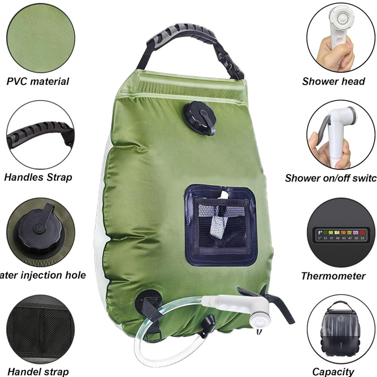 Портативная сумка для душа на солнечной батарее с подогревом для кемпинга. Ваше идеальное портативное гигиеническое решение для приключений на свежем воздухе. Эта сумка для душа с солнечной батареей обеспечивает 5 галлонов/20 л нагревательной воды для комфорта в кемпинге. Используя солнечную энергию, он обеспечивает теплый и освежающий душ в любой точке дикой природы.